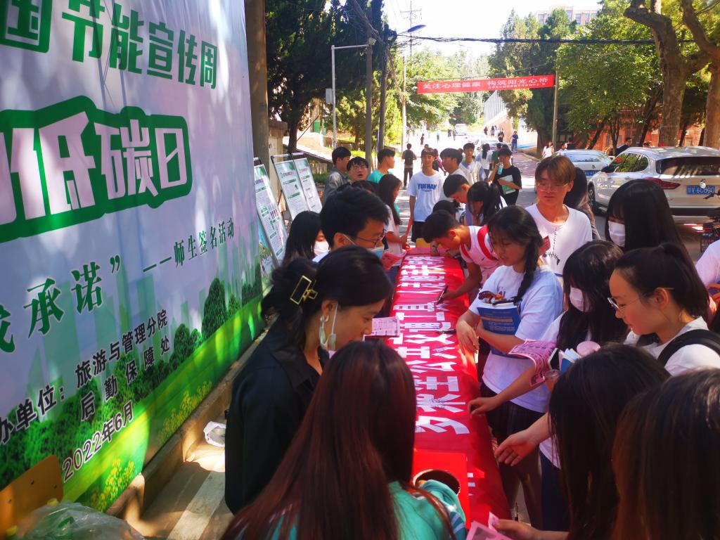 6月15日上午,学校后勤保障处、学生处、生态环境工程学院、旅游管理学院在三校区组织开展了“绿色低碳,节能先行”节能宣传周暨全国低碳日“节能减排我承诺”师生签名活动,倡导师生争当节能使者,共创生态文明。