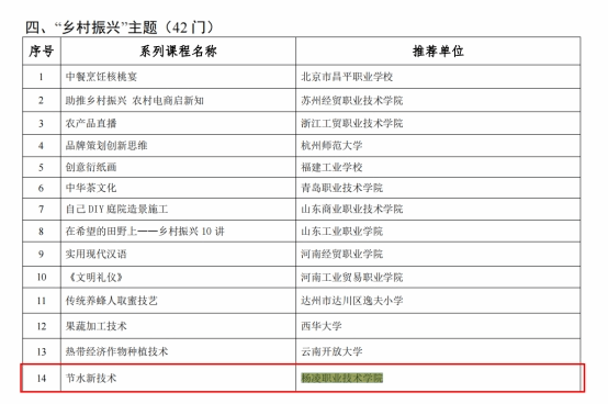 据了解,此次特色课程推介共享行动在各省级教育行政部门推荐基础上,经技术审查、内容审核、专家综合评议、教育部指定网站公示等环节,确定了913门系列特色课程,其中111所高职院校的303门课程入选。我校7门课程入选,位居全国第五、陕西第一。