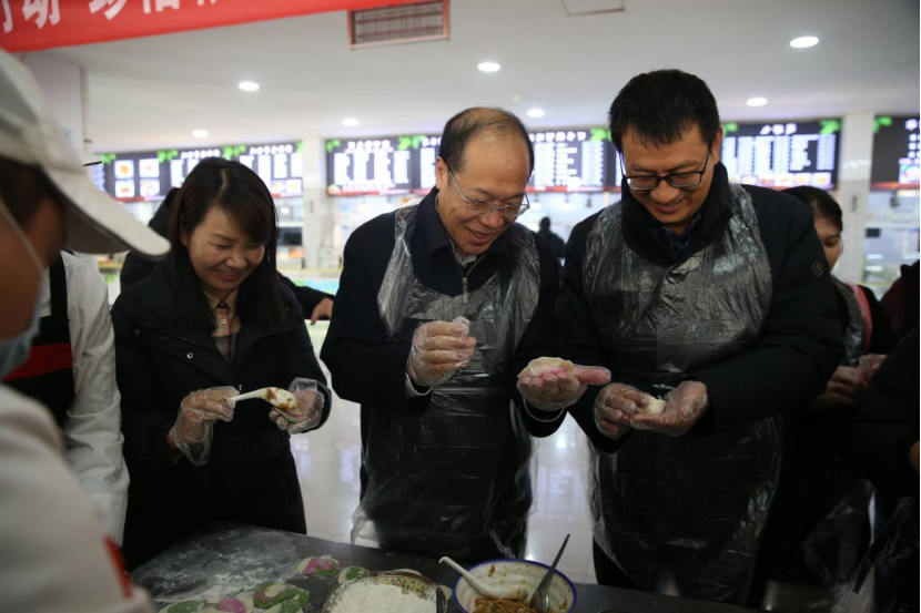 校长仲伟周、副校长蒋平江与学生共同包饺子