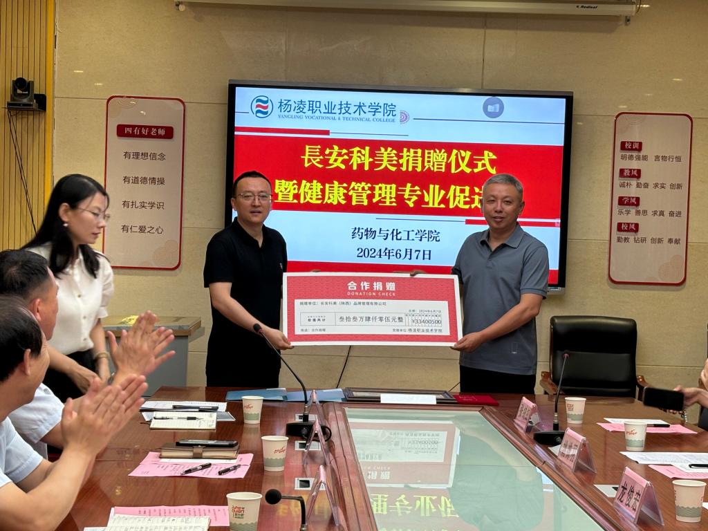 6月7日,长安科美有限公司捐赠仪式暨健康管理专业促进会在药物与化工学院天择楼召开。长安科美董事长龙俊宏、药物与化工学院负责人及教师代表等人参加会议。