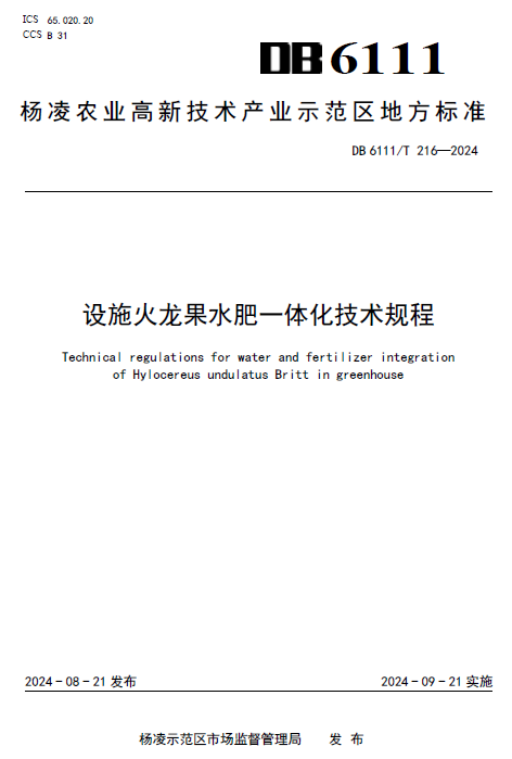 近日,学校为第一起草单位主编的3项火龙果地方标准获批发布,分别为《设施火龙果水肥一体化技术规程》(DB6111/T 216-2024)《设施火龙果产期调控技术规程》(DB6111/T 215-2024)《火龙果保险技术规程》(DB6111/T 217-2024),将于2024年9月21日起正式实施。