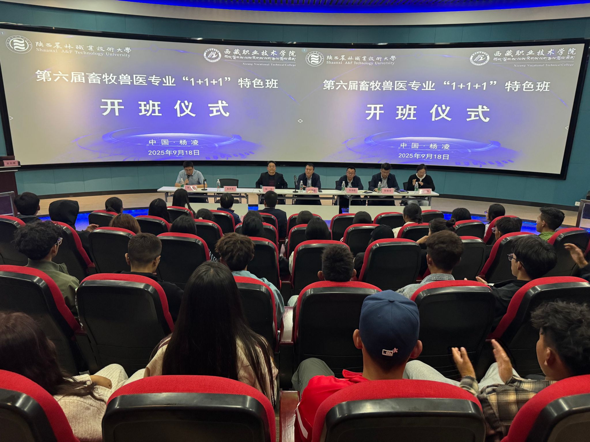 9月18日下午,学校举行第六届畜牧兽医专业“1+1+1”特色班开班仪式。当天,校长仲伟周专程慰问特色班同学,勉励大家要珍惜宝贵的青春年华,树立远大理想,夯实专业基础,锤炼过硬本领,勇于探索创新,不负时代,不负韶华。西藏职业技术学院动物科学技术学院院长刘海聪,我校党委副书记、纪委书记王勇胜出席开班仪式并讲话。西藏职业技术学院动物科学技术学院班主任刘倩,我校动物工程学院负责人、教师代表及畜牧兽医专业“1+1+1”特色班40名学生参加开班仪式。