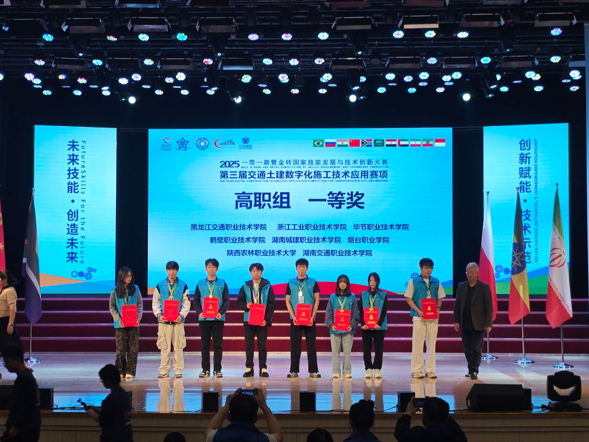 9月25日至27日,2025一带一路暨金砖国家技能发展与技术创新大赛第三届交通土建数字化施工技术应用赛项全国总决赛在哈尔滨铁道职业技术学院成功举办。本次大赛以“未来技能・创造未来”为主题,吸引了全国141所院校253支队伍同台竞技。经过激烈角逐,我校交通与测绘工程学院道路与桥梁工程技术专业董雄辉、黄家豪两名同学获得高职组一等奖,教师穆江飞获教师组二等奖,学校获最佳组织奖、优秀组织奖,指导教师穆江飞和吴彩星获优秀指导教师。