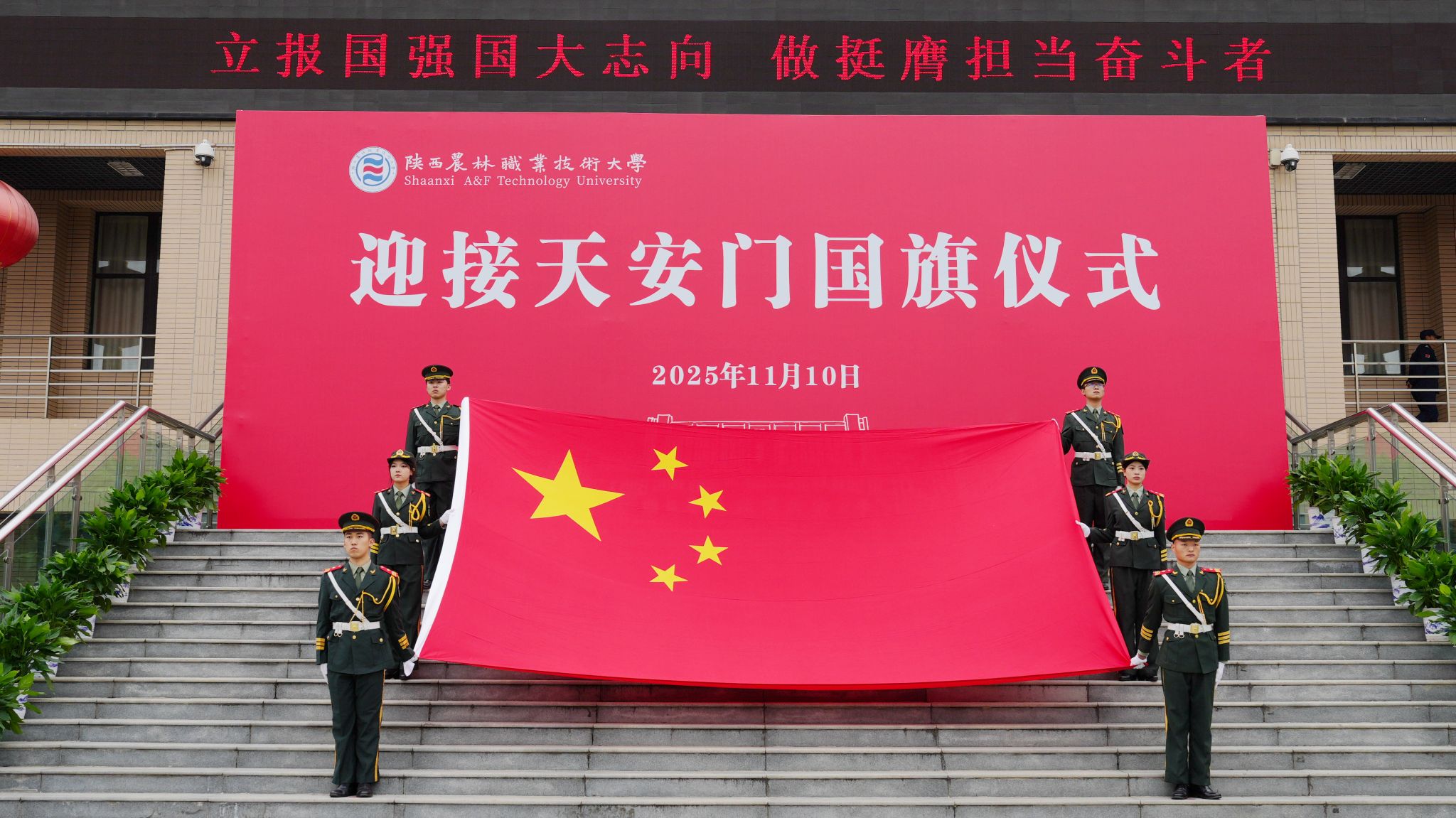 上午10时,仪式在雄壮的国歌声中正式开始。党委书记韩明军郑重宣读了由北京市天安门管理委员会颁发的获赠证书。他介绍,10月31日,北京市天安门管理委员会向学校赠送了2025年6月9日在天安门广场升挂的国旗。6月9日当天,天安门广场天气晴朗,风和日丽,该面编号为2025-0160的国旗,长5米,高3.3米,重1800克,整幅旗面无拼接,五颗五角星采用人工丝网印染工艺,于当天上午4时46分在天安门广场冉冉升起、迎风飘扬。国旗是国家的象征和标志,天安门广场升挂的国旗具有唯一性和特殊的历史价值,是蕴含特殊意义的爱国主义教育载体,承载着亿万中华儿女深厚爱国情怀。值得特别铭记的是,2025年6月9日也是教育部发文批准设立陕西农林职业技术大学之日,获赠2025年6月9日在天安门广场升挂的国旗,是对学校办学91年最好的总结,也承载着国家对陕西农林职业技术大学的殷殷期望,我们一定按照习近平总书记的嘱托,矢志强农报国,努力培养更多知农爱农的专业人才,为建设农业强国、推进中国式现代化作出新的贡献。
