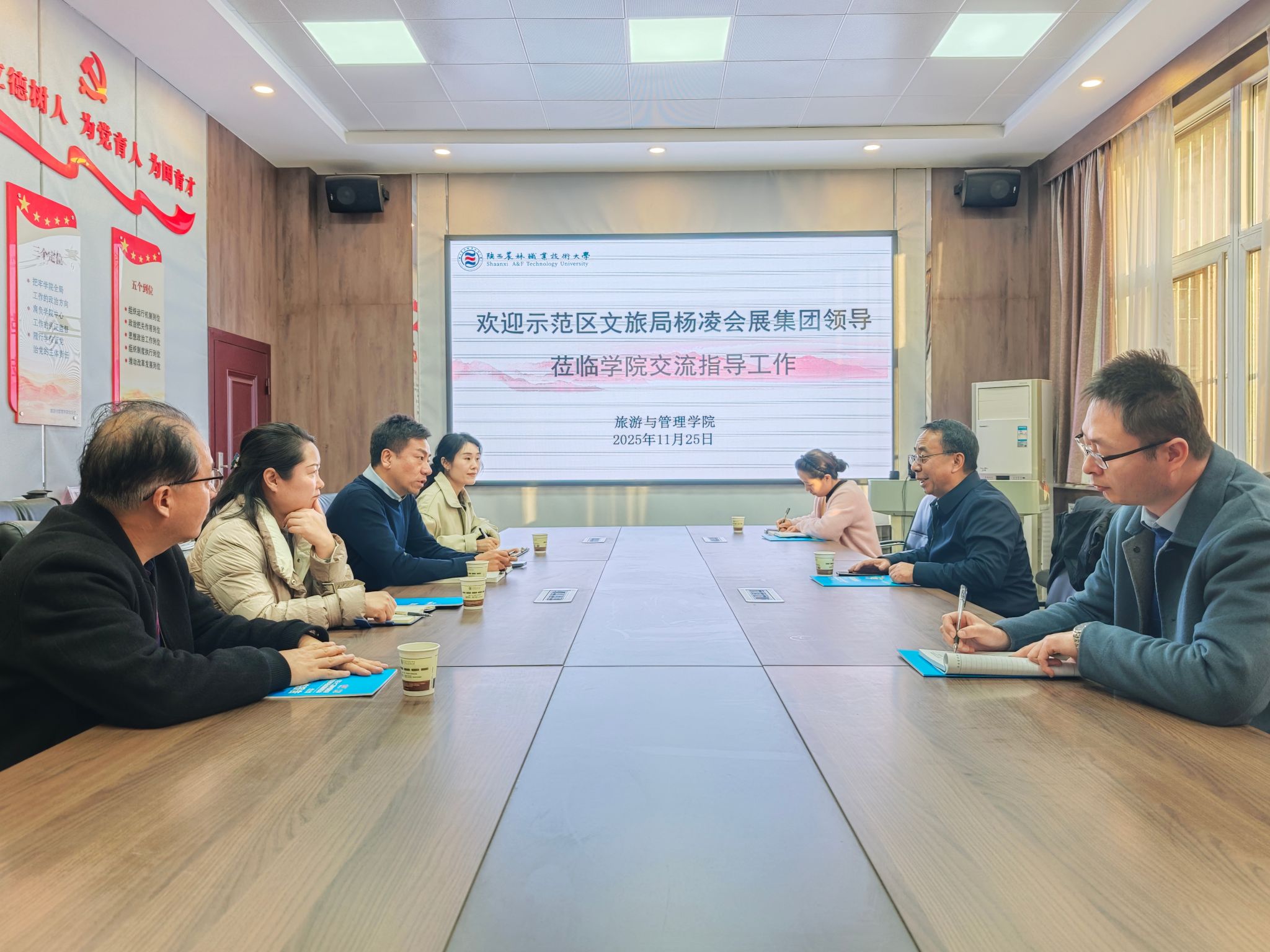 11月25日下午,杨凌示范区文化和旅游体育局局长刘甜甜、杨凌会展集团有限公司董事长聂超一行来校座谈交流,党委副书记、纪委书记、监察专员康强出席座谈会,旅游与管理学院负责人参加座谈会。