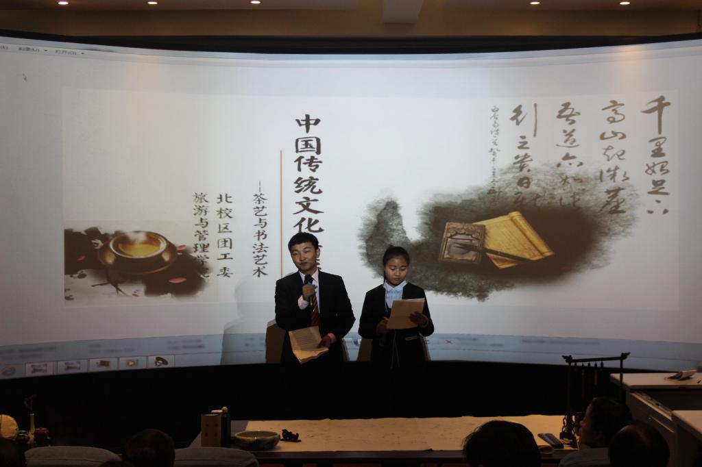 11月23日晚,由学院北校区团工委主办、旅游与管理分院团总支承办的“中国传统文化讲座——茶艺与书法艺术”在北校区3D模拟导游实训室开讲。讲座由中国书法家协会会员、我院书画艺术中心主任李德君老师及国家高级茶艺师、旅游与管理分院教师王晓娟老师主讲,旅游与管理学院学生、北校区书画爱好者共计100余人参加了讲座。院团委书记、旅游与管理分院负责人等应邀参加了本次活动。