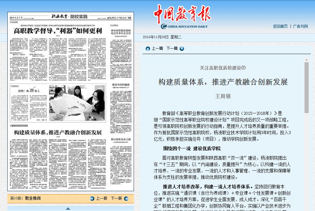 11月29日,《中国教育报》10版刊发了我院王周锁院长署名文章《构建质量体系  推进产教融合创新发展》,全文刊载如下(详情进入)