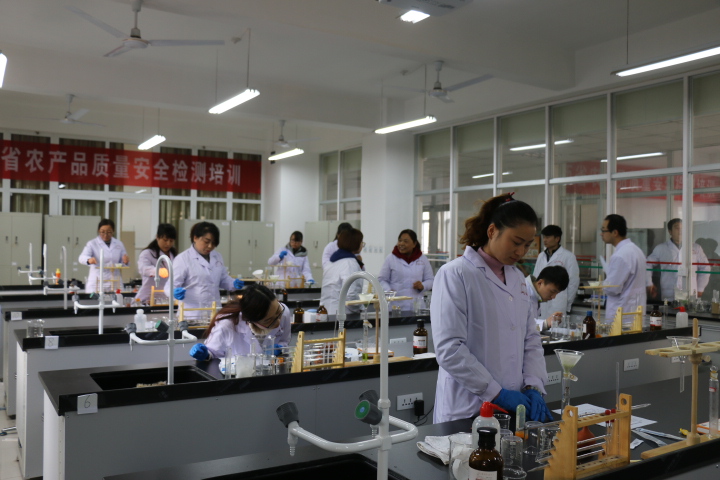 本次培训为期两周,旨在提高全省各级农业部门农产品质量检测站(中心)技术员的理论水平和实践操作能力,进而提升基层农产品质量安全检测技术水平及我省农产品质量安全管理水平,共有47名学员参加。当天上午,在我院生物工程分院实训室,全体学员进行了操作和理论考核。