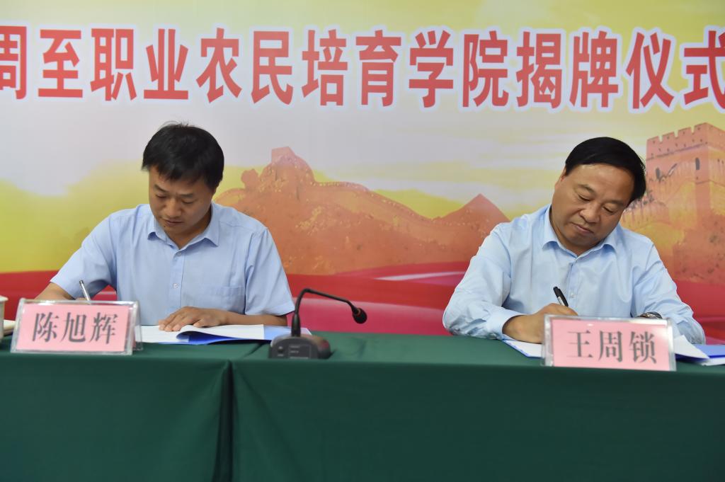 在当天上午举行的我院与周至县人民政府校政扶贫合作签字仪式暨周至职业农民培育学院揭牌仪式上,王周锁与陈旭辉代表双方签订了校政扶贫合作协议,刘建林与陈旭辉共同为我院周至职业农民培育学院揭牌,职业农民代表作了交流发言。