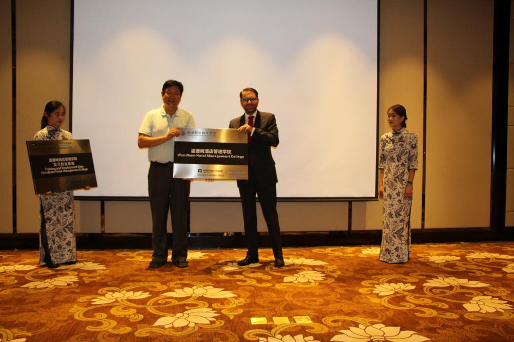 随后,Flank与王晓地分别代表双方签署校企合作协议,并互授“温德姆酒店管理学院”和“温德姆酒店管理学院实习就业基地”的牌匾。拜存有与Flank分别为酒店部门经理和旅管分院部分教师颁发了“兼职教师”和“企业培训导师”聘书。学院实习生进行了工作制服展示,轻松愉快、精彩纷呈的展示将会场气氛推向了又一个高潮。