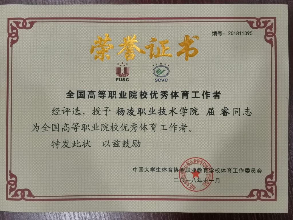 当天晚上,会议举行了职教分会成立 10 周年颁奖盛典,对全国高等职业院校优秀体育工作者进行了表彰,为全国高等职业院校第二批“一校一品”示范基地建设单位进行了授牌,对全国高等职业院校竞赛“优秀参赛学校”、“优秀承办学校”进行了表彰,同时对为高职体育工作做出特殊贡献的4位代表颁发了“突出贡献奖”。我院体育课教师屈睿被评为“全国高等职业院校优秀体育工作者”称号。