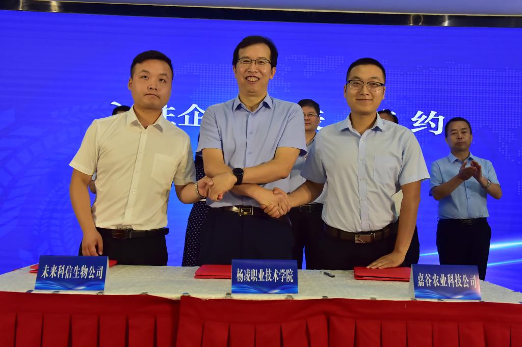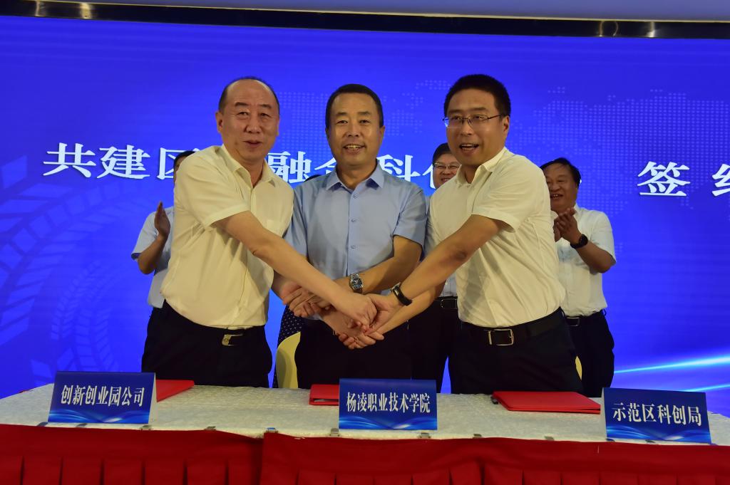 胡俊鹏与示范区科技创新局局长赫思远、示范区创新创业园发展有限公司董事长薛海兵签订了区校融合科创中心暨大学生创新创业教育基地共建协议,为区校进一步融合,地方政府、科技部门与高校合作打下坚实基础;杨凌职业技术学院产教融合处副处长郑爱泉与首批入驻的企业代表签订了入驻协议。