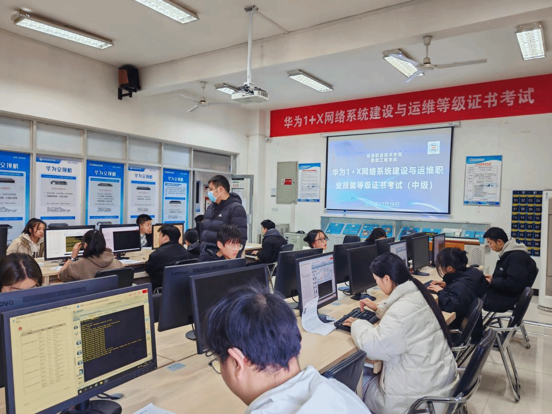12月28日,华为“1+X”网络系统建设与运维职业技能等级证书考试(中级)在南校区举行,信息工程学院共23名学生参加考试。