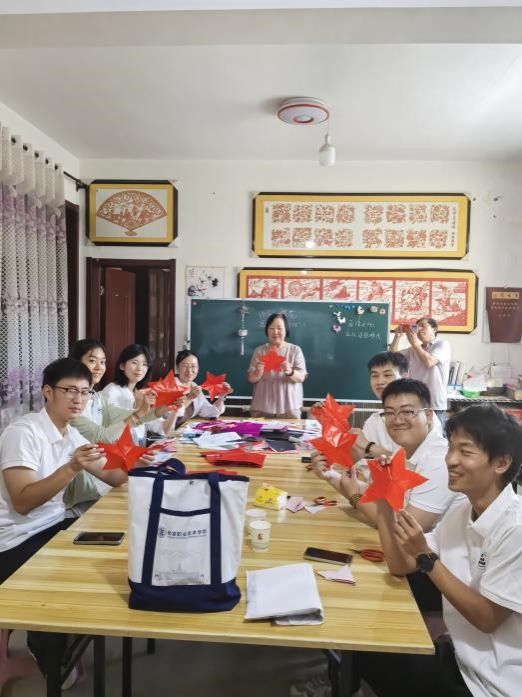 在合阳焕能民俗文化工坊,队员们见到了中华文化促进会剪纸艺术委员会委员、古莘书画院工艺美术专业委员会主任、省级非遗传承人赵焕能老人。满墙色彩艳丽的纸塑窗花作品,从“喜上眉梢”到“耕读传家”,一张张窗花诉说着农耕文明的浪漫。队员们围坐学习“折、画、剪、展”工序,从手忙脚乱到渐入佳境,在一次次尝试中感受非遗技艺的精妙。