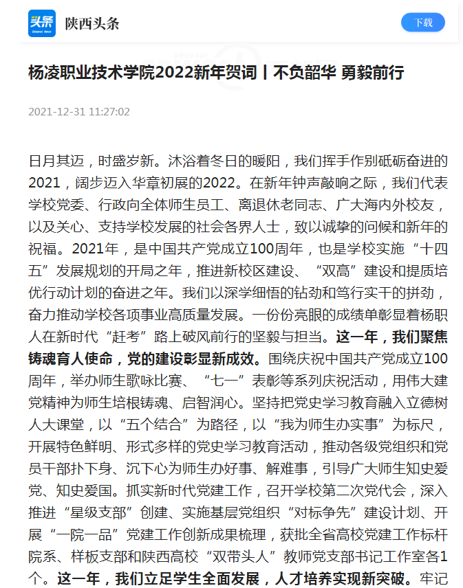 这一年,我们着眼中外合作办学,国际交流开创新局面。开展多层次、多元化的国际交流活动,在几内亚、乌兹别克斯坦分别成立几内亚水利工程学院、杨凌职业技术学院古利斯坦国立大学现代农业学院,启动实施“中国—以色列现代节水工程课程合作项目”,积极参与上合农业基地中乌现代农业科技示范园建设,并在乌兹别克斯坦成立现代农业技术创新示范基地,学校国际化办学水平显著提升。多难兴邦聚众力,同舟共济勇担当。近期,我省全力以赴做好新冠肺炎疫情防控工作,希望广大师生继续弘扬伟大抗疫精神,严格遵守疫情防控各项规定,切实做好个人防护,以坚定的信心与必胜的决心等待云开雾散、静候繁华盛景,以奋斗者的姿态向2022年全力进发,不断开创新时代学校事业发展的新局面。最后,衷心祝愿全体师生员工、离退休老同志、广大海内外校友以梦为马,不负韶华!岁岁常欢愉,万事皆胜意!祝愿我们杨凌职业技术学院基业常青、欣欣向荣!