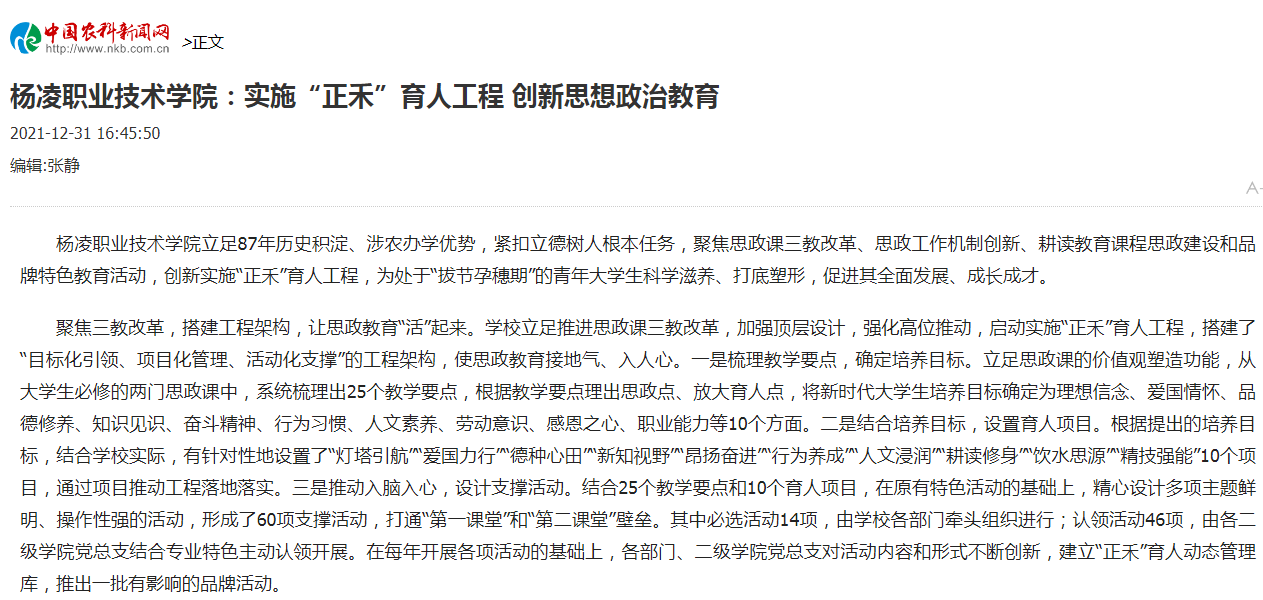 杨凌职业技术学院立足87年历史积淀、涉农办学优势,紧扣立德树人根本任务,聚焦思政课三教改革、思政工作机制创新、耕读教育课程思政建设和品牌特色教育活动,创新实施“正禾”育人工程,为处于“拔节孕穗期”的青年大学生科学滋养、打底塑形,促进其全面发展、成长成才。