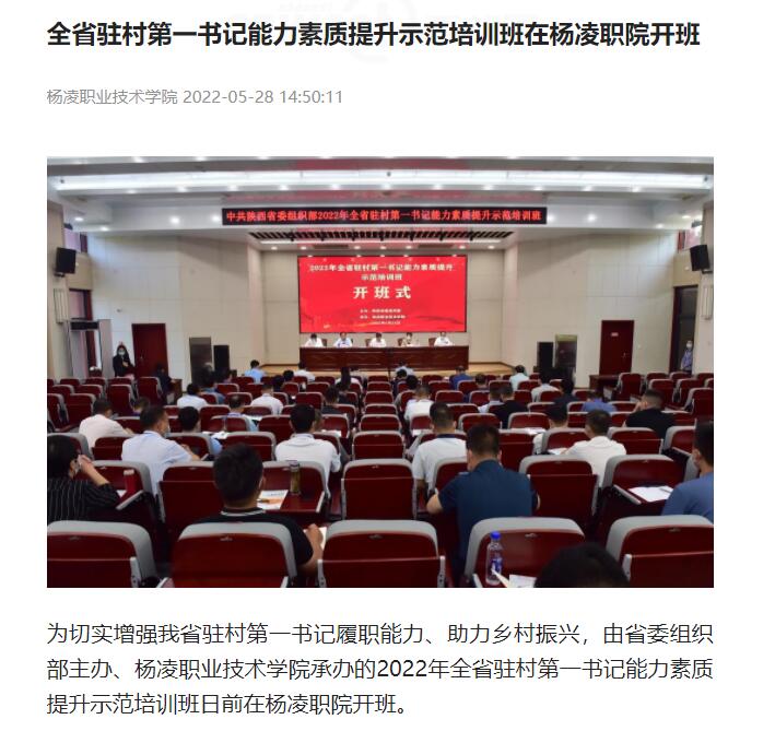 为切实增强我省驻村第一书记履职能力、助力乡村振兴,由省委组织部主办、杨凌职业技术学院承办的2022年全省驻村第一书记能力素质提升示范培训班日前在杨凌职院开班。