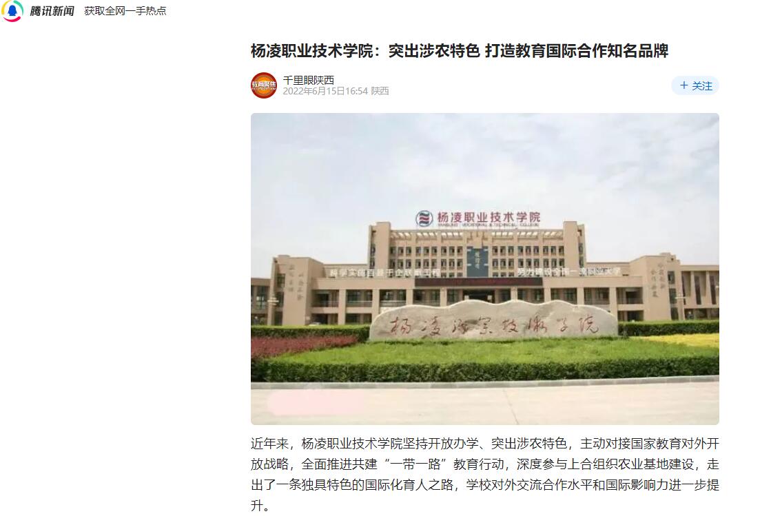 近年来,杨凌职业技术学院坚持开放办学、突出涉农特色,主动对接国家教育对外开放战略,全面推进共建“一带一路”教育行动,深度参与上合组织农业基地建设,走出了一条独具特色的国际化育人之路,学校对外交流合作水平和国际影响力进一步提升。