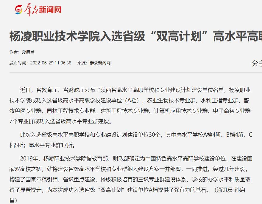 近日,省教育厅、省财政厅公布了陕西省高水平高职学校和专业建设计划建设单位名单,杨凌职业技术学院成功入选省级高水平高职学校建设单位(A档),农业生物技术专业群、水利工程专业群、畜牧兽医专业群、园林工程技术专业群、建筑工程技术专业群、计算机应用技术专业群、电子商务专业群7个专业群成功入选省级高水平专业群建设。