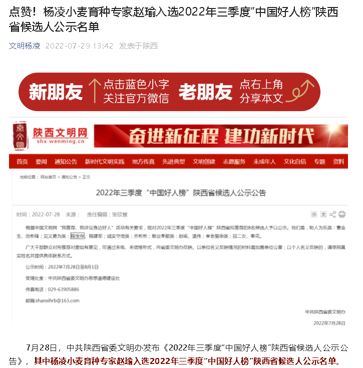 赵瑜,男,1935年7月生,陕西省杨凌职业技术学院退休研究员,小麦育种专家。1959年从中国农业大学毕业后,主动请缨扎根地处偏僻的陕西省农业学校扶风豆村育种基地,坚持小麦育种研究至今。60多年来,先后培育出“武农132”“武农99”“武农113”等9个小麦品种,累计推广面积8800多万亩,遍及黄淮麦区,实现农民增收50亿元。曾荣获“陕西省科学大会奖”“陕西省科学技术二等奖”“陕西省道德模范”“陕西省优秀共产党员”“陕西好人榜”等荣誉。