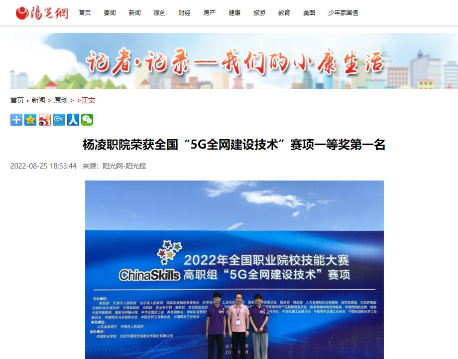 阳光讯(陈阳 崔晓 记者 赵小康)8月22日至23日,2022年全国职业院校技能大赛高职组“5G全网建设技术”赛项在济南职业学院举办,来自全国28个省、56支代表队、112名选手参加了比赛。经过8个小时的激烈比拼,杨凌职业技术学院信息工程学院学生郑嘉昊、曹文森以总分排名全国第一的成绩,荣获一等奖第一名,取得杨凌职院自参赛以来历史最好成绩,指导教师康晋、陈高锋荣获大赛优秀指导教师奖。