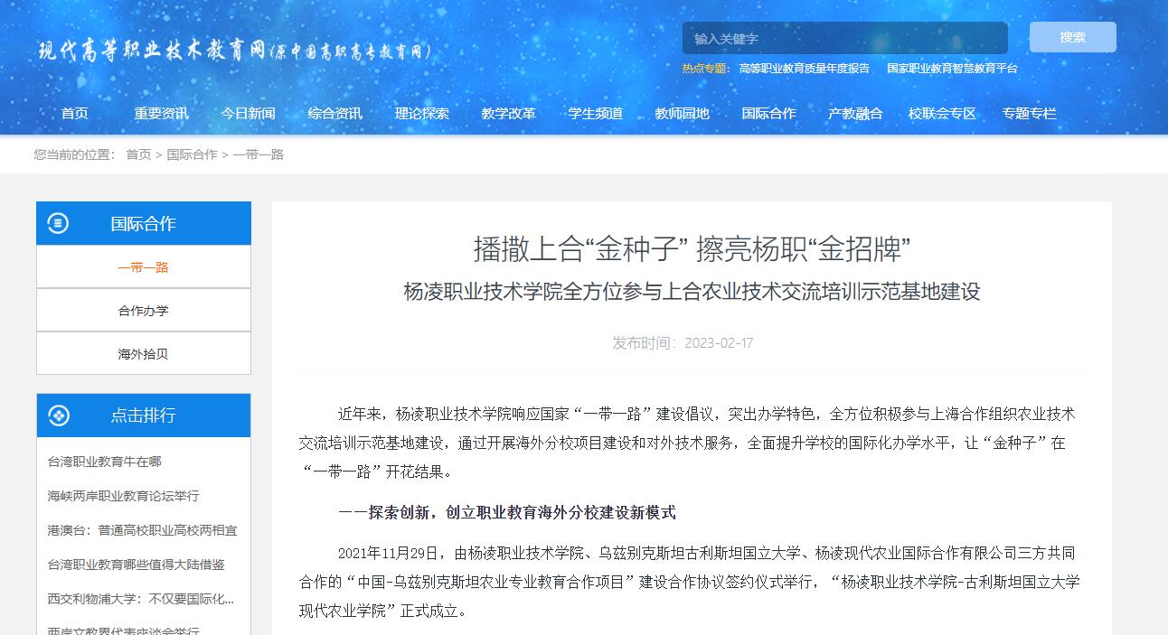 近年来,杨凌职业技术学院响应国家“一带一路”建设倡议,突出办学特色,全方位积极参与上海合作组织农业技术交流培训示范基地建设,通过开展海外分校项目建设和对外技术服务,全面提升学校的国际化办学水平,让“金种子”在“一带一路”开花结果。