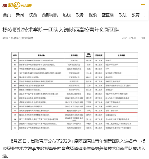 8月29日,省教育厅公布了2023年度陕西高校青年创新团队入选名单,杨凌职业技术学院李龙教授牵头的畜禽肠道健康与高效养殖技术创新团队成功入选。