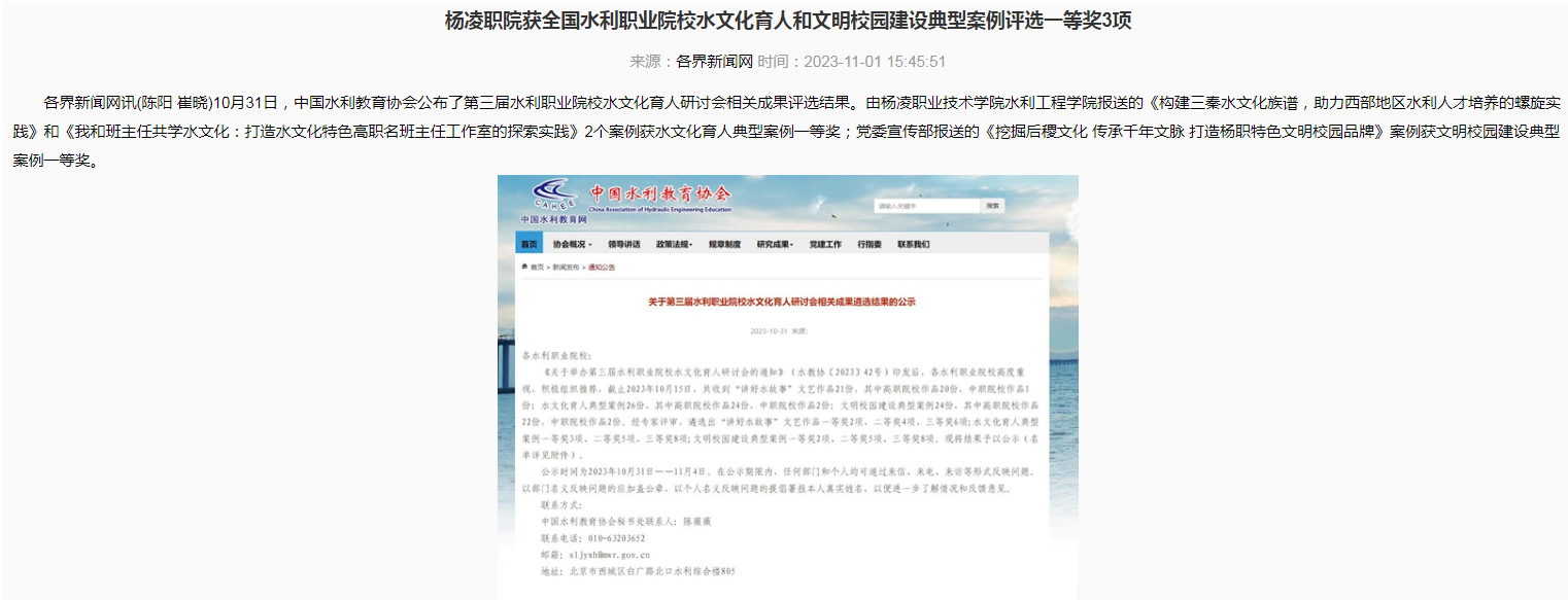 各界新闻网讯(陈阳 崔晓)10月31日,中国水利教育协会公布了第三届水利职业院校水文化育人研讨会相关成果评选结果。由杨凌职业技术学院水利工程学院报送的《构建三秦水文化族谱,助力西部地区水利人才培养的螺旋实践》和《我和班主任共学水文化:打造水文化特色高职名班主任工作室的探索实践》2个案例获水文化育人典型案例一等奖;党委宣传部报送的《挖掘后稷文化 传承千年文脉 打造杨职特色文明校园品牌》案例获文明校园建设典型案例一等奖。