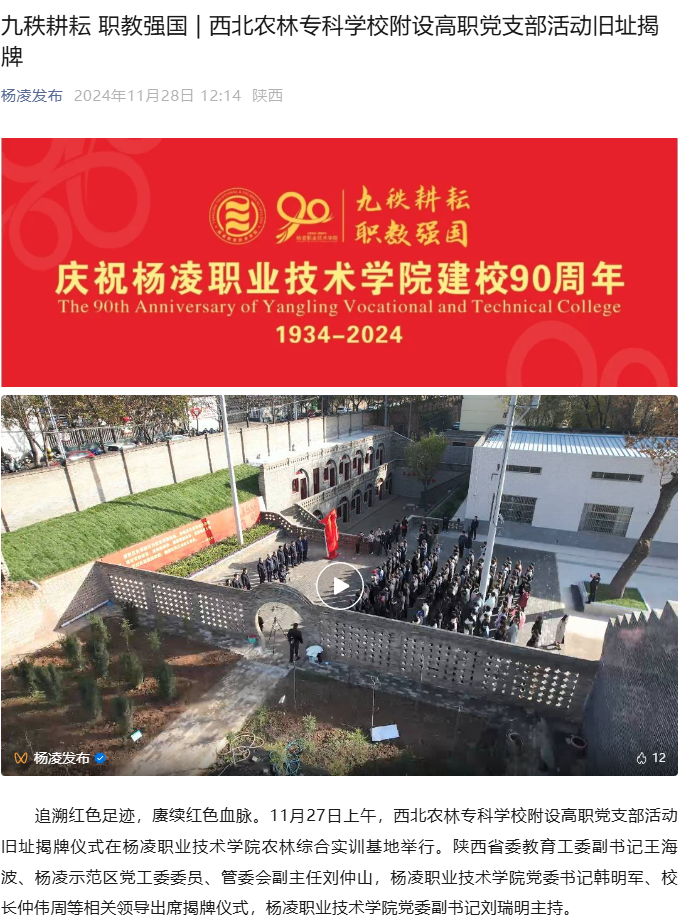 追溯红色足迹,赓续红色血脉。11月27日上午,西北农林专科学校附设高职党支部活动旧址揭牌仪式在杨凌职业技术学院农林综合实训基地举行。陕西省委教育工委副书记王海波、杨凌示范区党工委委员、管委会副主任刘仲山,杨凌职业技术学院党委书记韩明军、校长仲伟周等相关领导出席揭牌仪式,杨凌职业技术学院党委副书记刘瑞明主持。