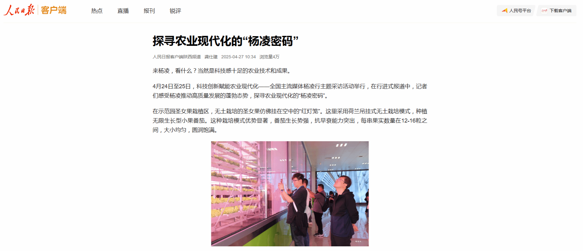 4月24日至25日,科技创新赋能农业现代化——全国主流媒体杨凌行主题采访活动举行,在行进式报道中,记者们感受杨凌推动高质量发展的蓬勃态势,探寻农业现代化的“杨凌密码”。