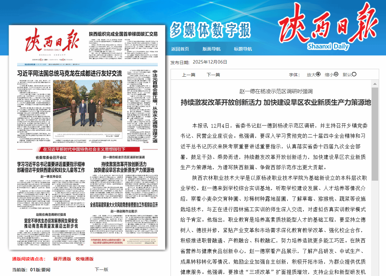 12月4日,省委书记赵一德到杨凌示范区调研,并主持召开乡镇党委书记、民营企业座谈会。他强调,要深入学习贯彻党的二十届四中全会精神和习近平总书记历次来陕考察重要讲话重要指示,认真落实省委十四届九次全会部署,鼓足干劲、乘势而进,持续激发改革开放创新活力,加快建设旱区农业新质生产力策源地,为谱写陕西新篇、争做西部示范作出更大贡献。