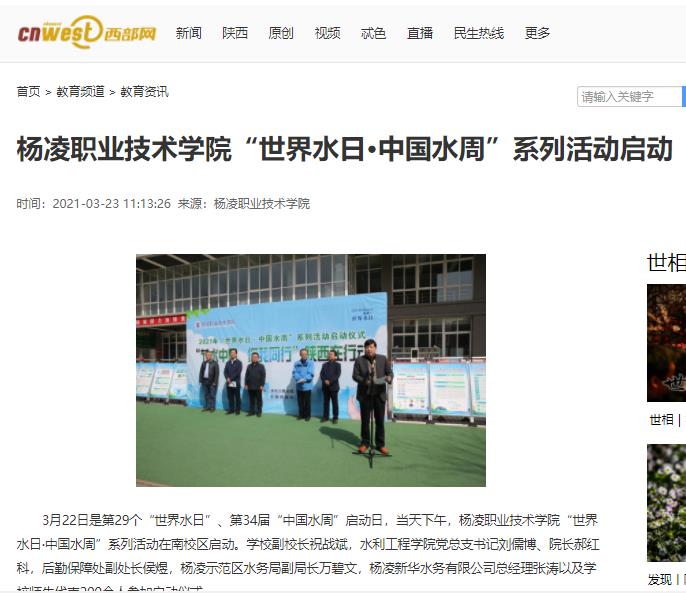 今年“世界水日”的主题是“珍惜水·爱护水”,“中国水周”的主题是“深入贯彻新发展理念,推进水资源集约安全利用”。杨凌职业技术学院作为全国水利高等职业教育示范院校,主题是“发展节水型校园,引领珍惜水,爱护水的良好风尚”。“中国水周”期间,学校将举行节水知识讲座、参观渭河杨凌段生态综合治理工程、发放节水宣传册等系列活动。