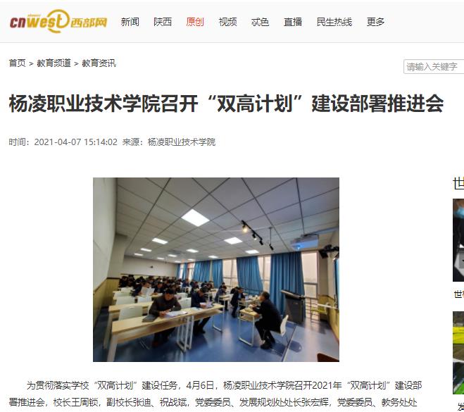 会议汇报了杨凌职业技术学院“双高计划”绩效监测平台填报情况,梳理了“双高计划”建设以来在工作中存在问题,并提出了解决方案,同时安排部署了2021年“双高计划”建设及“提质培优行动计划”任务工作。