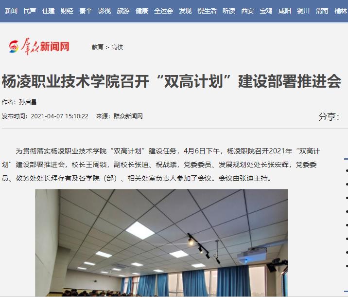 为贯彻落实杨凌职业技术学院“双高计划”建设任务,4月6日下午,杨凌职院召开2021年“双高计划”建设部署推进会,校长王周锁,副校长张迪、祝战斌,党委委员、发展规划处处长张宏辉,党委委员、教务处处长拜存有及各学院(部)、相关处室负责人参加了会议。会议由张迪主持。