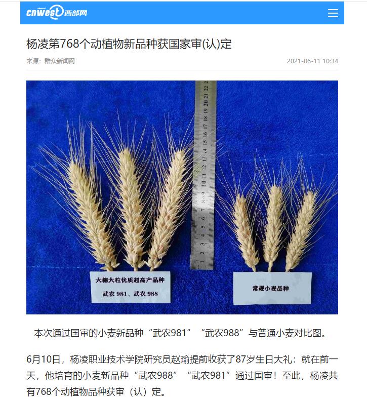 6月10日,杨凌职业技术学院研究员赵瑜提前收获了87岁生日大礼:就在前一天,他培育的小麦新品种“武农988”“武农981”通过国审!至此,杨凌共有768个动植物品种获审(认)定。