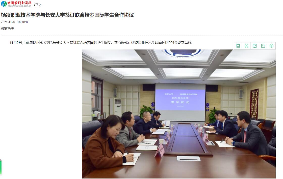 11月2日,杨凌职业技术学院与长安大学签订联合培养国际学生协议。签约仪式在杨凌职业技术学院南校区204会议室举行。