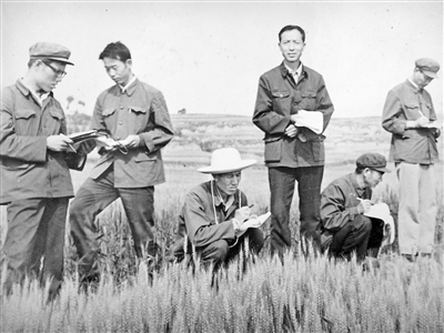 1975年,赵瑜(右三)为前来观摩的农技人员介绍小麦育种试验情况。资料图片