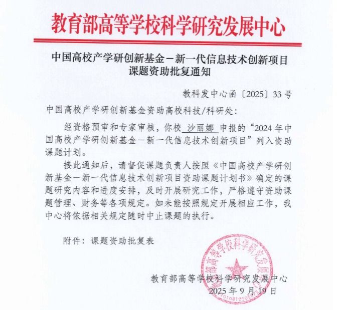 9月19日,教育部高等学校科学研究发展中心公布了2024年中国高校产学研创新基金——新一代信息技术创新项目立项名单。由我院教师沙丽娜主持申报的《基于“5G+人工智能”的智慧校园节水灌溉创新研究与应用》项目,成功获批一般专项。